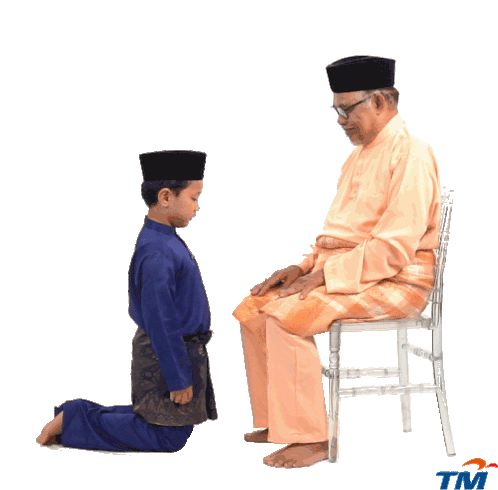 A young boy kneels to seek forgiveness from an elder, a traditional and respectful Hari Raya gesture.