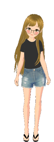 Leeboo Ileeboo, an animated girl with brown hair, glasses, black t-shirt, and denim shorts, stands in an idle pose.