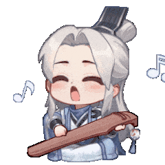 Chibi Xioling from Legend of Phoenix plays a traditional guzheng, surrounded by floating musical notes.