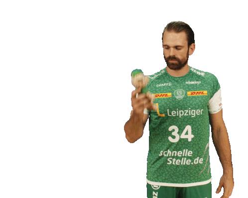 Alen Milosevic, the Leipzig handball player, smiles and gives a thumbs-up while holding a small mascot toy.