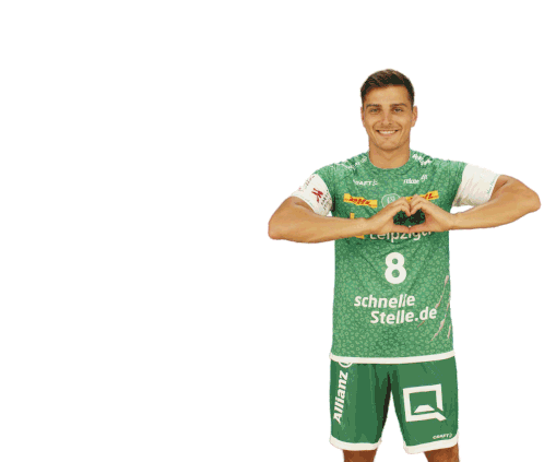 Lucas Krzikalla, a handball player for Leipzig, smiles and forms a heart shape with his hands, showing love.