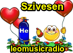 Animated sticker featuring red heart balloons, a helium tank, a smiling emoji, and the text 'Szivesen leomusicradio'.