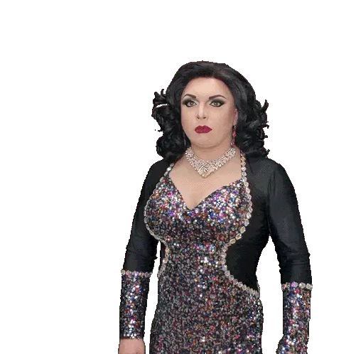 a drag queen wearing a sequined dress and a necklace with her mouth open