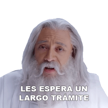 Poncho Borbolla as God, with long white hair and beard, warns 'Les espera un largo trámite' (A long process awaits you).