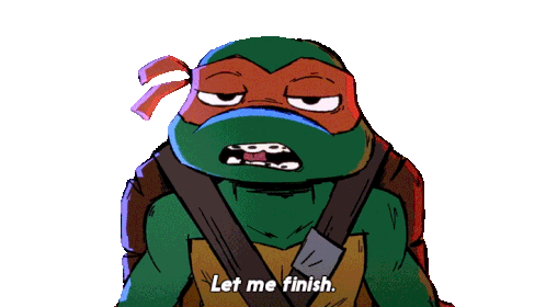 Michelangelo from TMNT, looking annoyed, says 'Let me finish.' expressing a need to complete his thought.