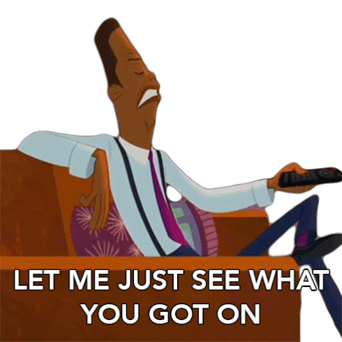 Oscar Proud from The Proud Family, sitting on a couch with a remote, saying "Let Me Just See What You Got On".
