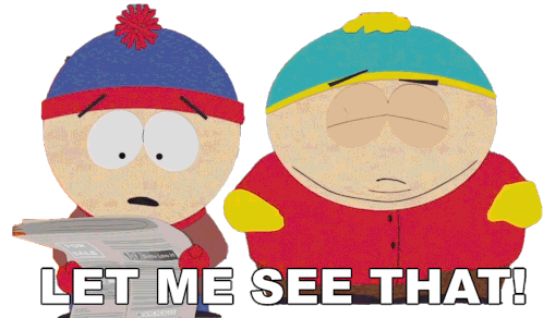 Eric Cartman holds a newspaper as Stan Marsh peeks over his shoulder, both exclaiming 'Let Me See That!' in this South Park sticker.
