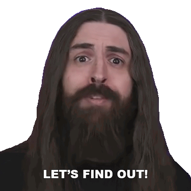 Samus Paulicelli, with long hair and a beard, looks surprised and says "LET'S FIND OUT!".