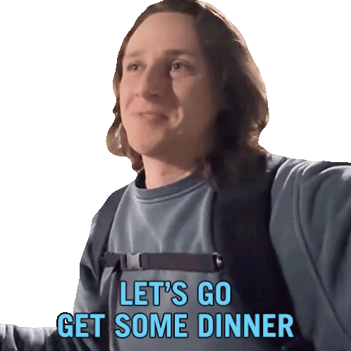 Michael Downie, wearing a backpack, enthusiastically suggests, 'Let's go get some dinner,' with a hopeful expression.