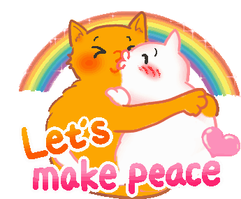Two cartoon cats, initially sad, transform to happily hug and kiss under a rainbow, symbolizing 'Lets Make Pesce'.