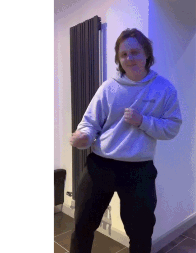 Lewis Capaldi and Sarahmcfadyen show off some fun dance moves, smiling and grooving in a light grey hoodie.