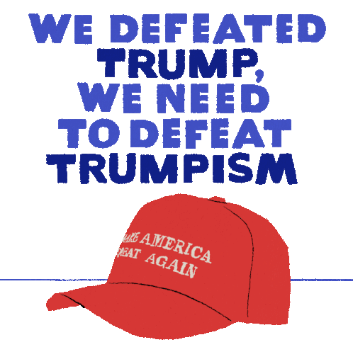 An animated sticker with the message 'WE DEFEATED TRUMP, WE NEED TO DEFEAT TRUMPISM' as a foot stomps a MAGA hat.