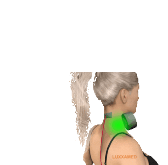 An animated sticker showing a woman's neck with a green light therapy and microcurrent device, branded Luxxamed.