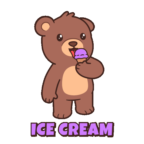 A cute cartoon teddy bear happily licks a purple scoop of ice cream from a cone, with 'ICE CREAM' text below.