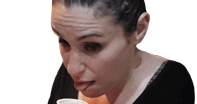 A woman with her tongue out, licking the contents of a small cup, seemingly tasting something with a curious expression.