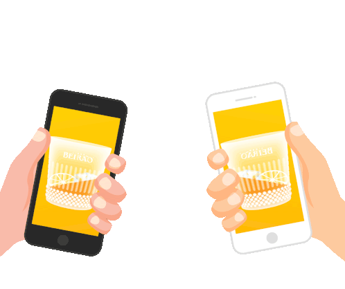 Two hands holding smartphones displaying a glass of Licor Beirão, clinking in a digital toast.