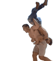 Gus and Jeremiah from Floribama Shore share a playful moment, with one lifting the other upside down on his back.