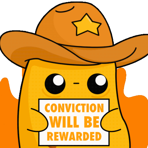 Lil Potate, the cute potato character in a cowboy hat, holds a sign proclaiming 'Conviction Will Be Rewarded'.