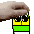 Lili E Lilão, a cute yellow and green cartoon character with sunglasses, held by a hand.