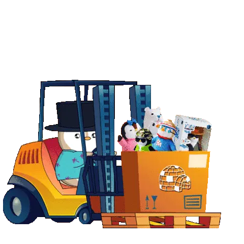 A cute Linde Lindem forklift character with a halo, whistling innocently next to a crumpled box.