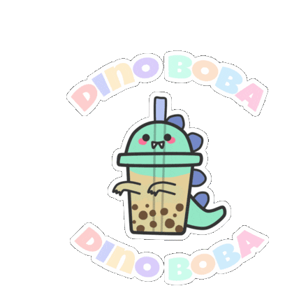 Animated sticker of a cute dinosaur-shaped boba tea cup with 'Dino BOBA' text, wiggling playfully.