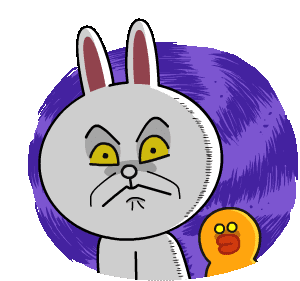 Cony from Line Characters frowns with an annoyed expression, while Sally peeks from behind, set against a purple background.