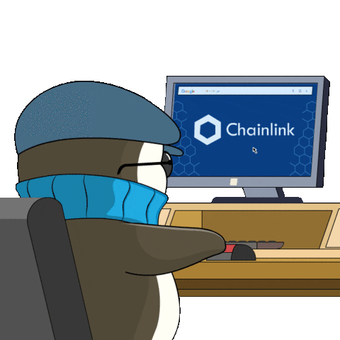 A cute Pudgy Penguin works on a computer displaying the Chainlink logo, representing blockchain technology.