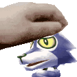 Lobo from Animal Crossing gets a gentle head pat, looking happy and content with a squishy expression.