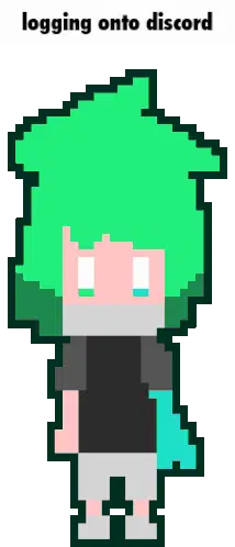 A pixel art character, Tommy3x3, with spiky green hair and a black shirt, blinks in this animated sticker related to logging onto Twitter.