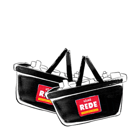 Two black shopping baskets from Lojas Rede, filled with products, ready for a shopping spree.