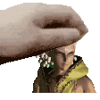 Loki from Bayonetta, a cute animated sticker, receives a small white flower placed gently on his head by a hand.