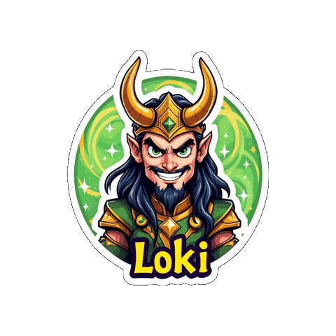 a sticker of a man with horns and the word loki