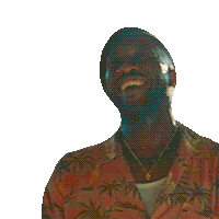 Duncan Kincaid from Jurassic World Rebirth laughs heartily, wearing a pink Hawaiian shirt with palm trees and a gold chain.