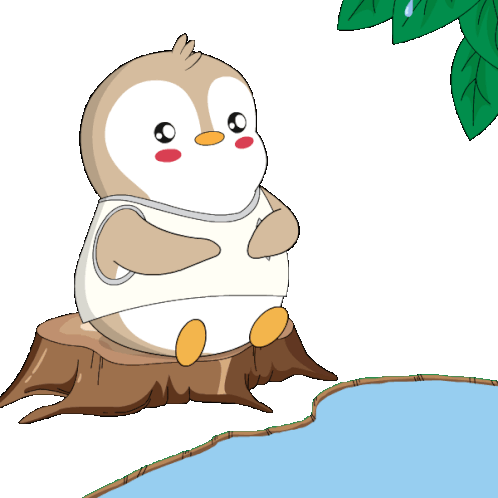 A pudgy cartoon penguin sits alone on a tree stump, looking lonely and pondering by the water.