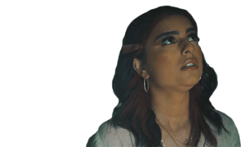 Renforshort, wearing hoop earrings and a necklace, looks up with an observant and searching gaze.