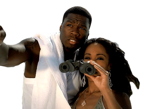 50 Cent, also known as Curtis James Jackson III, and a woman intently look into the distance, with the woman using binoculars.