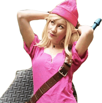 Kay Lynn Syrin cosplays as Link from The Legend of Zelda, looking up with a relaxed pose and pink attire.