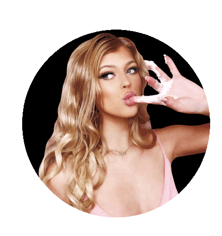Loren Gray playfully licks frosting from her finger, with the word 'CAKE' animating in the background. A sweet and fun moment.