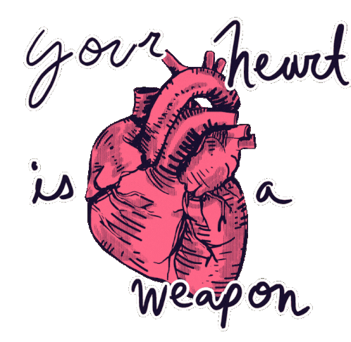 Animated sticker of a pink heart transforming into a fist, with text 'your heart is a weapon' and 'the size of a FIST', symbolizing resilience and strength.