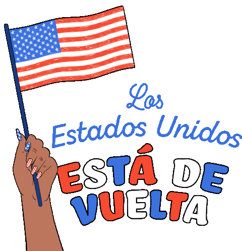 A hand with patriotic nails waves an American flag, accompanied by the Spanish text "The United States Is Back."