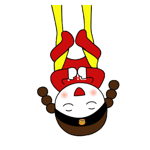 A cute cartoon girl performs upside-down lotus positions workouts, showcasing flexibility and a playful mood with a burger icon.