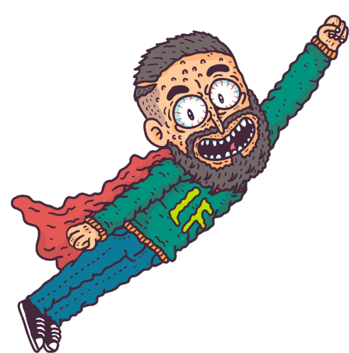 Loudflavor Superman character flying with a red cape, wide smile, and intense eyes, ready for action.