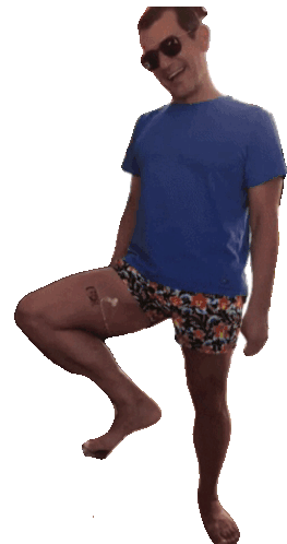 Louie, a man in sunglasses and floral shorts, strikes a happy pose with a big smile, perfect for a fun sticker.