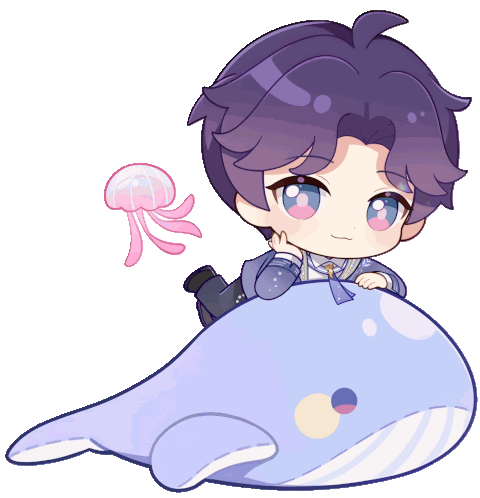 a boy is laying on top of a blue whale with a pink jellyfish behind him