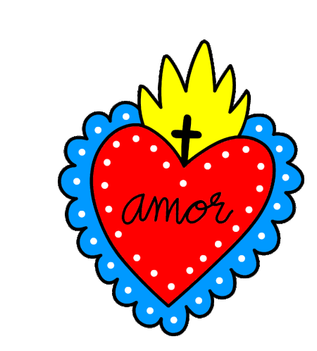A vibrant Sacred Heart sticker featuring the word "amor" (love) in the center, surrounded by a blue scalloped border and topped with yellow flames and a cross.