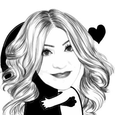 A black and white caricature of a smiling woman with wavy hair, being hugged from behind with a love heart.