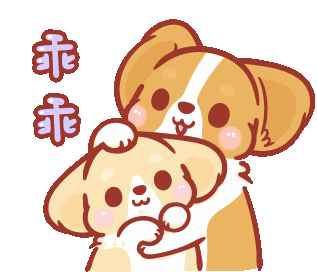 Two adorable cartoon dogs share a warm hug, with the comforting Chinese phrase 'Good boy/girl' displayed.