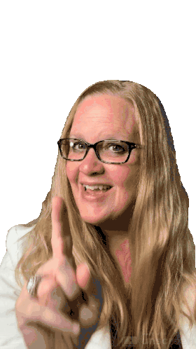 a woman wearing glasses and a white jacket points her finger at the camera
