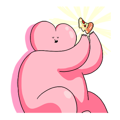 A cute, pink, blob-like cartoon character with a heart-shaped head happily holds a sparkling slice of pizza.