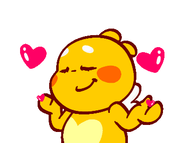 Qoobee, the adorable yellow character, expresses love by making a heart gesture with floating pink hearts.